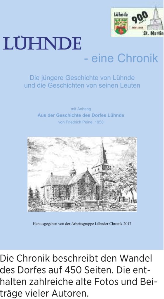 Die Autoren konzentrieren sich vor allem auf die Entwicklung des Dorfes in den vergangenen 70 Jahren, auf Menschen, Vereine und Ereignisse, die mancher künftige Leser der Chronik aus eigenem Erleben kennt. In den beschriebenen Jahrzehnten hat sich wohl mehr verändert als in vielen Jahrhunderten vorher. „Der Zeitraum ist gekennzeichnet durch ein rasantes Lebenstempo und einen enormen technischen Fortschritt mit epochalen Umwälzungen auf politischem, sozialem, geistigem und kulturellem Gebiet“, schreiben die Autoren in ihrem Vorwort. Zusammenschlüsse brachten Veränderungen mit sich – zunächst vor mehr als 40 Jahren auf politischer Ebene, als Lühnde zur Gemeinde Algermissen kam, und vor wenigen Jahren im kirchlichen Bereich, als die Lühnder Gemeinde ihre Selbstständigkeit verlor und im großen Gebilde der Zwölf-Apostel-Kirche aufging. Dem Leser wird auch bewusst, was die Lühnder Infrastruktur in den vergangenen Jahrzehnten an Vielfalt eingebüßt hat, besonders in Handel und Gewerbe. So erinnert die Chronik an den Fischhandel und die örtlichen Friseure ebenso wie an Mühlenbetriebe und Viehhändler – und an so manche Lühnder Originale und ihre Geschichten– von Küsterin Lizzi über „Inspektor Lüders“ bis hin zu „Kraxelhuber“. Im Endspurt brachten vor allem Wolfgang Müller und Dr. Ralf-Dieter Reumann das Chronik-Projekt über die Ziellinie. Zur Arbeitsgruppe gehörten außerdem Wilhelm Grefe, Helga Klingbeil, Elisabeth Nicklowitz, Wilhelm Oelkers, Karl-Heinz Rehberg und Dr. Horst-Ekkehard Wittneben. Mehrere Dutzend weiterer Einwohner verfassten einzelne Beiträge. Neben Vereinsfestschriften lieferte auch das Büchlein „Aus der Geschichte des Dorfes Lühnde“ von Friedrich Peine wichtige Grundlagen. Die ersten 100 Vorbestellungen werden durch die erste Auflage der Chronik bedient, ein Nachdruck ist möglich. Wer Interesse hat, kann sich bei Wolfgang Müller (05126 / 96283) oder Ralf Reuman (0 51 26/13 07) melden.