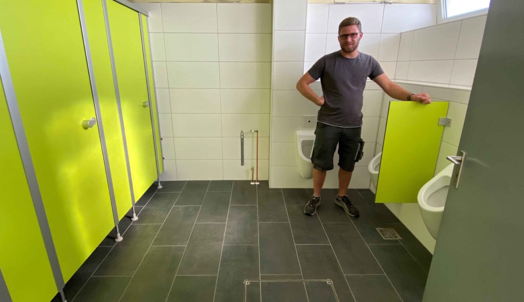 Pünktlich zum ersten Schultag konnten die Grundschulkinder wieder die Toilettenanlage nutzen. Die Trennwände leuchten bereits in den neuen Farben Limonengrün, Clementine und Manhattan. Der Maler für die Wandarbeiten führt seine Arbeiten in den Herbstferien aus.