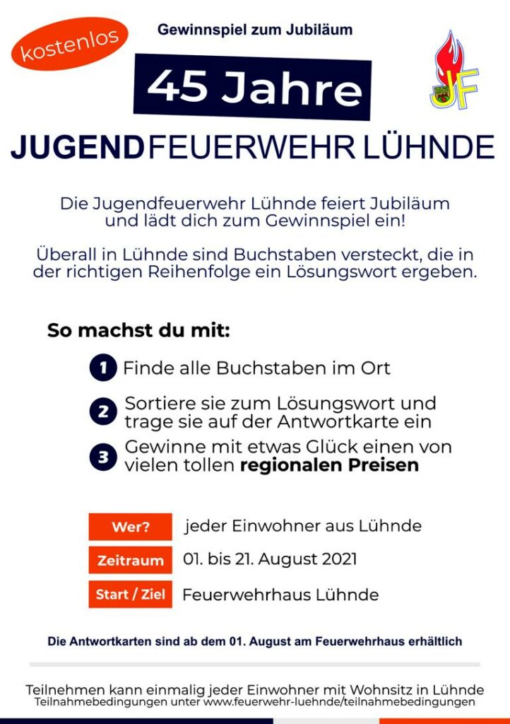 Die Jugendfeuerwehr Lühnde wird in diesem Jahr 45 Jahre alt. Eigentlich wollten die Mitglieder ein großes Fest ausrichten. Wegen der Pandemie verzichten sie allerdings darauf. Alternativ starten die Heranwachsenden und Betreuer im August ein Gewinnspiel, an dem das ganze Dorf teilnehmen kann.