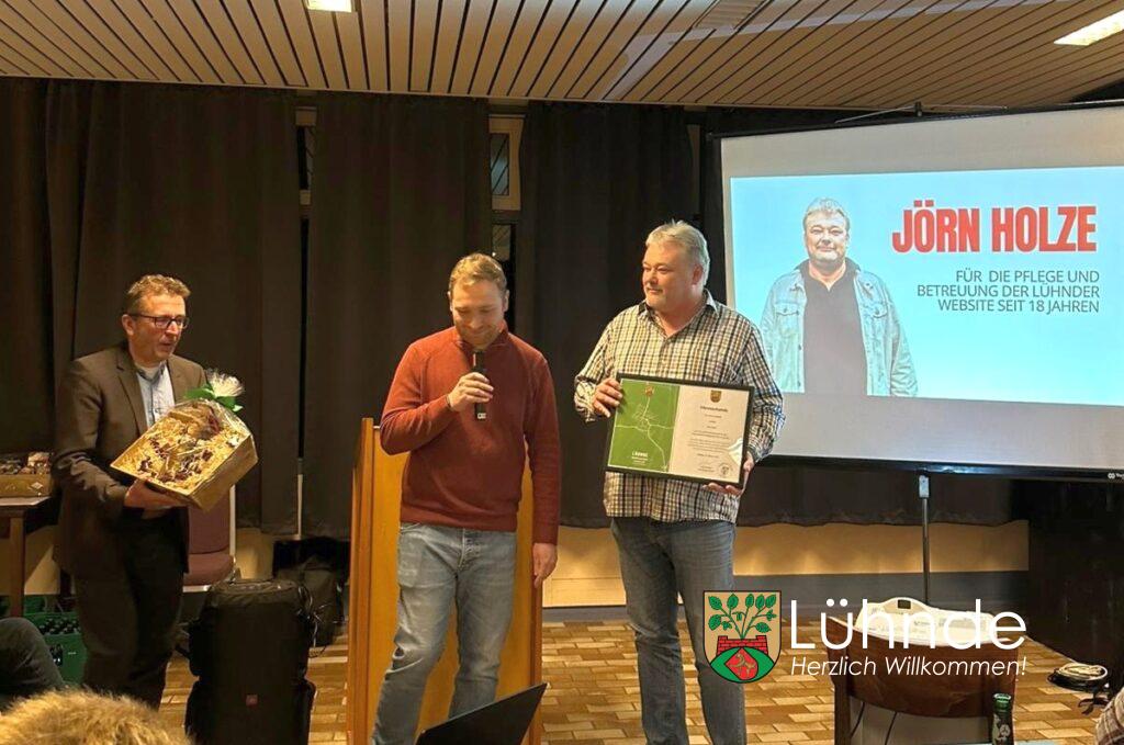 Jörn Holze wurde für 18 Jahre ehrenamtliches Engagement geehrt. Seit 2008 pflegt und betreut er mit großem Einsatz die Lühnder Website und leistet damit einen wichtigen Beitrag zur Information, Öffentlichkeitsarbeit und zum Zusammenhalt im Ort.