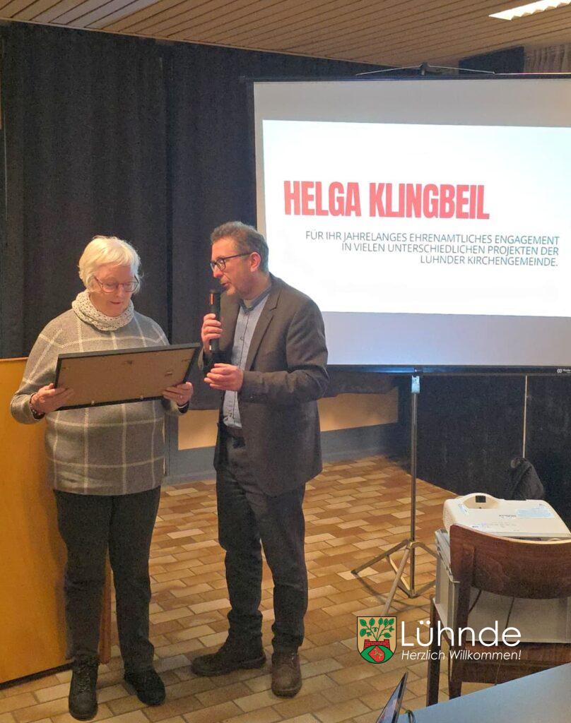 Helga Klingbeil erhielt eine Urkunde als Anerkennung für ihr langjähriges ehrenamtliches Wirken in zahlreichen Projekten der Lühnder Kirchengemeinde. Besonders hervorzuheben ist ihr Einsatz bei den ökumenischen Friedensgebeten, die sie gemeinsam mit der katholischen Kirche in der Gemeinde mitgestaltet.