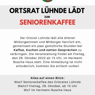 Der Ortsrat Lühnde lädt alle älteren Mitbürgerinnen und Mitbürger herzlich ein. Seniorenkaffee des Ortsrates Lühnde Freitag, 28. Oktober ab 15 Uhr Hermann-Busche-Haus in Lühnde