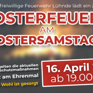 Die Freiwillige Feuerwehr Lühnde lädt zum Osterfeuer am 16. April 2022 um 19.00 Uhr am Brennplatz am Ehrenmal auf dem Mühlenberg ein. Für das leibliche Wohl ist selbstverständlich gesorgt. Wie...