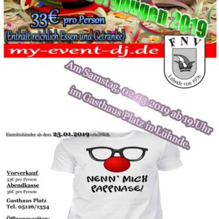 Hiermit lade ich alle Lühnder Mitbürgerinnen und Mitbürger herzlich zu unserer traditionellen Fastnachtsbürgerversammlung im Gasthaus Platz am Freitag, 1. März, 18 Uhr, Gasthaus Platz, Lühnde, ein. Wie in jedem Jahr...